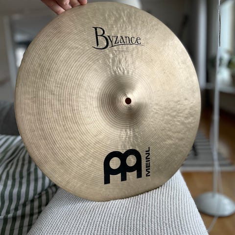 Meinl Byzance cymbaler i par. Traditionellt hamrade cymbaler i mässing med blank finish. Passar som del av ett trumset eller för orkester- och ensemblebruk. Hål i centrum för montering på cymbalstativ eller för användning med remmar vid orkesterspel.