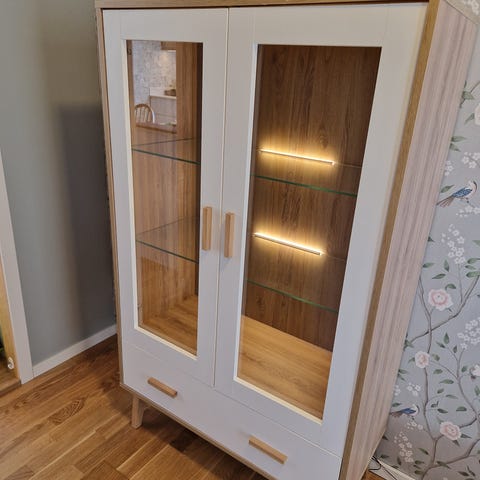 Smalt vitrinskåp i bra bruksskick. Själva skåpet stomme lådor mm är i bra skick. Redo för upphämtning.