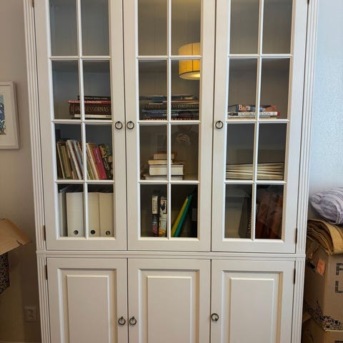 Obs! Någon liten fläck på ett par hyllor. Syns ej när det står saker i skåpet. 2 bredare hyllor nedtill och 2 smalare hyllor upptill. Det går spröjs tvärs över glas dörrarna (spröjsen längst ned fattas) samt det syns lim vid ett par av spröjsen.