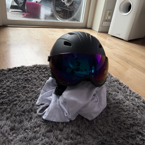Everest skidhjälm med integrerat visir i spegelglas. Hjälmen är svart med diskret mönster på sidorna och har ventilationsöppningar upptill. Justerbart hakspänne och vadderade öronpartier. Visiret är fällbart och täcker hela ögonområdet för skydd mot vind och snö. Passar för alpin skidåkning och snowboardåkning.