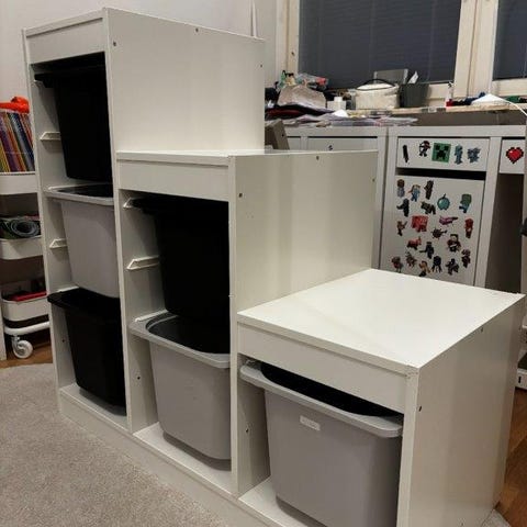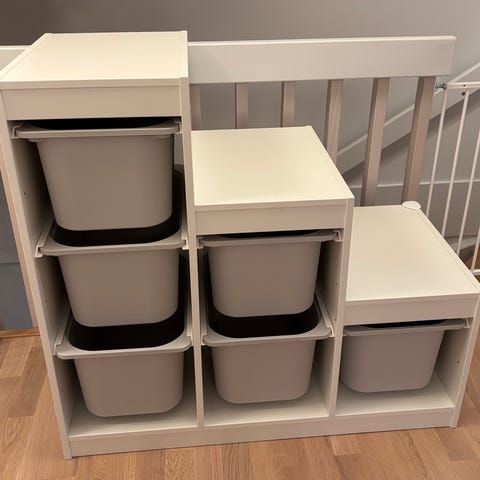 IKEA förvaringshylla med tre plastlådor i vitt. Hyllan är fristående och lämpar sig för förvaring i barnrum, lekrum eller andra utrymmen där leksaker, kläder eller småsaker behöver organiseras. Stommen är i vit skiva och lådorna är utdragbara plastbackar. Passar mot vägg eller som del av en förvaringslösning tillsammans med annan möblering.