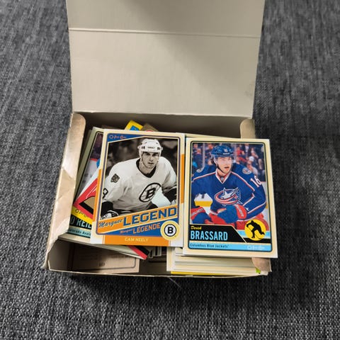Samling med blandade hockeykort från olika serier och lag. Kort i standardstorlek, levereras i en lång förvaringslåda av kartong. Passar för samlare eller som grund för en större kortsamling.