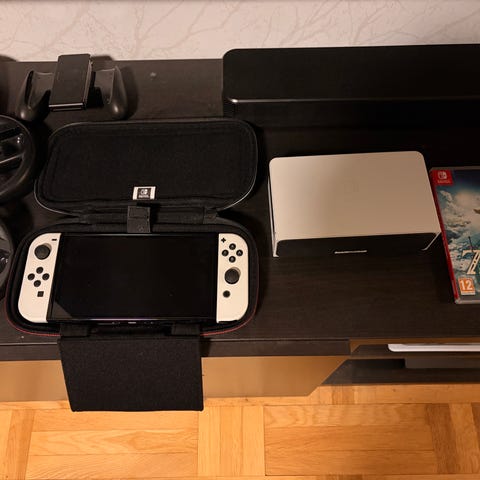 Nintendo Switch Oled konsol vit. Dockningsstation, handkontrollhållare, en trådad handkontroll, skyddsväska med Super Mario-motiv samt kablar. Flera Nintendo Switch-spel i fysiskt format ingår. Passar för tv-spel hemma eller i bärbart läge.