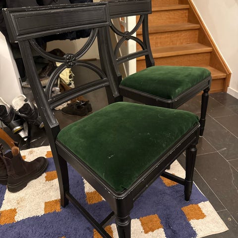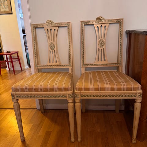Två klassiska stolar (Axet) med stabila stommar. Lös sits gör dem mycket enkla att klä om i valfritt tyg.