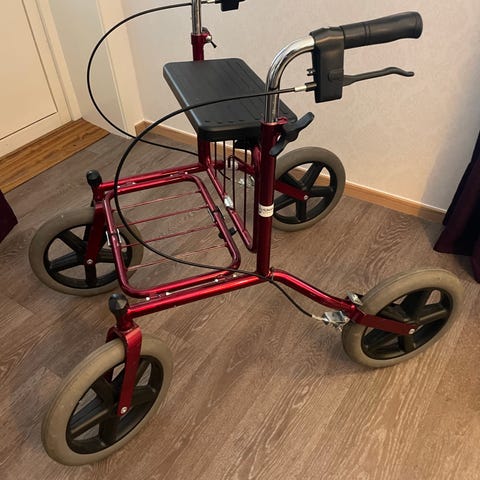 Handtag med bromsar för ökad kontroll. Passar som gånghjälpmedel för vuxna som behöver extra stöd vid förflyttning och möjlighet att sitta och vila vid behov.