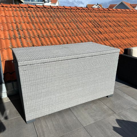 Låda i plåt. Använd för att förvara lysrör.