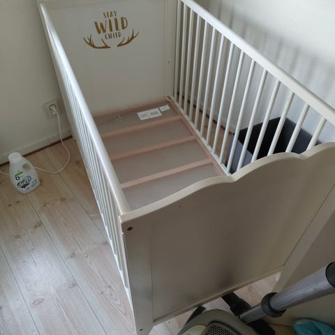 Oanvänd spjälsäng JLY , bara stått monterad. Spjälsängsskydd & madrass följer med.