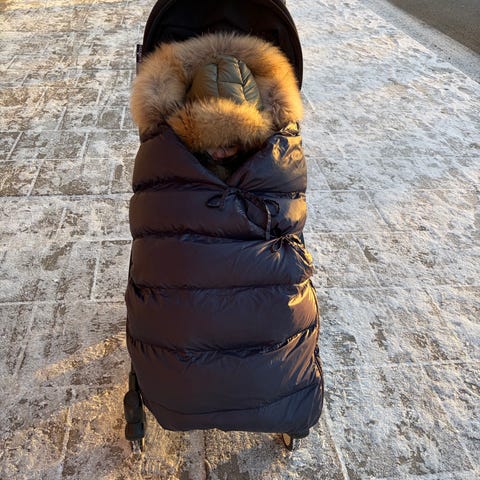 Fin och varm dunåkpåse från Colmar i vit färg. Använd sparsamt och i nyskick. Perfekt för kalla promenader i vagn – mjuk, varm och vattenavvisande.