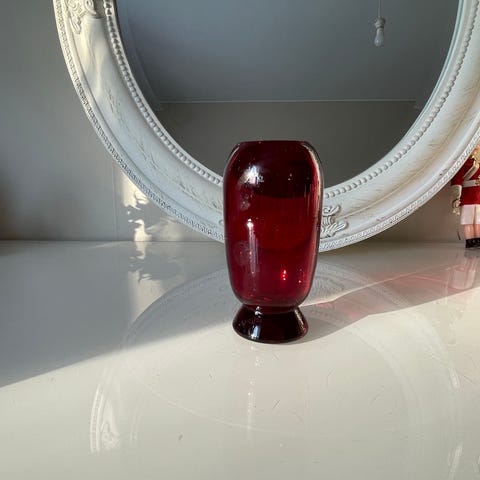 Säljer tre vackra delar svenskt konstglas i djup röd rubinton. Tunga och gedigna föremål, troligen från 1950–70-tal. Klassisk design som passar både i modern och retro inredning.