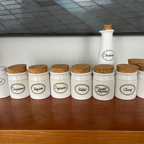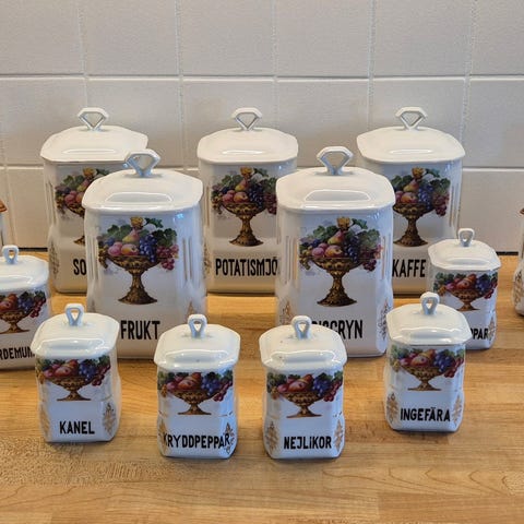 Burkar av okänt märke i porslin för förvaring av kryddor och torra varor. Burkarna är fyrkantiga med lock och har vit basfärg med flerfärgat frukt- och bladmotiv på framsidan samt text som anger innehåll, till exempel kanel, vitpeppar och kaffe. Passar för förvaring av kryddor, socker och andra torra livsmedel i kök. Burkarna kan placeras på bänk eller i skåp som praktisk och dekorativ förvaring.