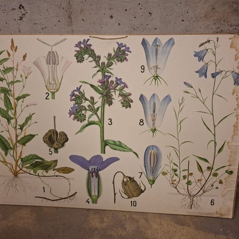 Jag säljer 3 st skolplanscher med olika växtmotiv. En är med en smörblomma, potatisväxt och vete. De är lite skadade i kanterna men de är jätte charmiga ändå.