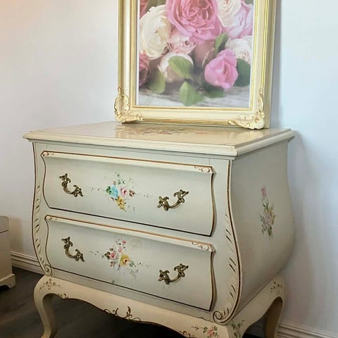 Renoverad byrå som fått en ljus beige/vit färg med massa vackra ornament och gamla bladguldade beslag.