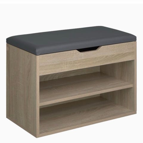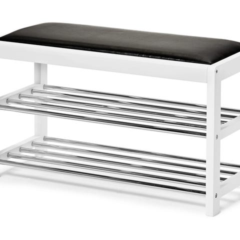 IKEA hallmöbel formgiven av Aage Petersen. Möbeln består av en vit förvaringsdel med låda och öppna hyllor samt en separat vit skobänk med uppfällbar skoförvaring och svart sittdyna. Passar i hall eller entré för förvaring av skor, accessoarer och mindre saker. Vitlackad yta med handtag på låda och skoförvaring för enkel öppning och stängning.