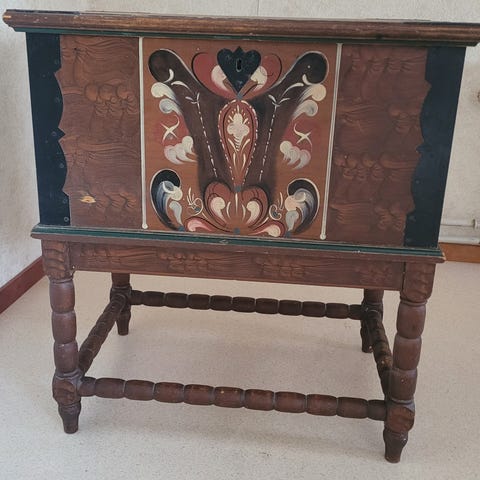 Snygg trä kista med handmålat motiv, daterad 1954