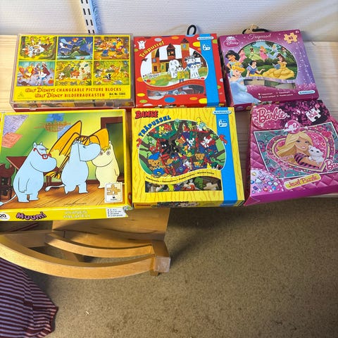 Paket med 6 st pussel i ram. Lite slitage men i det hela fina, och inget fattas.