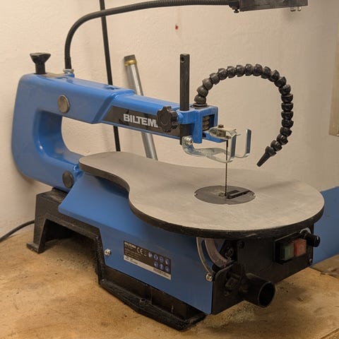 Ryobi dekupørsåg med integrerad arbetslampa. Sågen har ett stabilt stativ och ett skydd framför klingan för säkrare användning. Elanslutning via sladd på framsidan. Lämplig för precisionssågning i mindre trädetaljer, hobbyprojekt och modellbyggen.