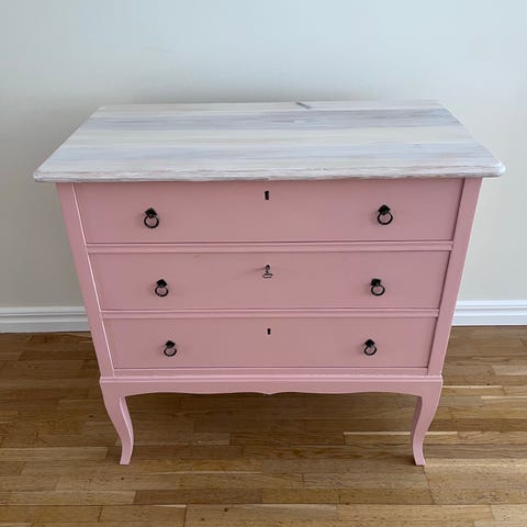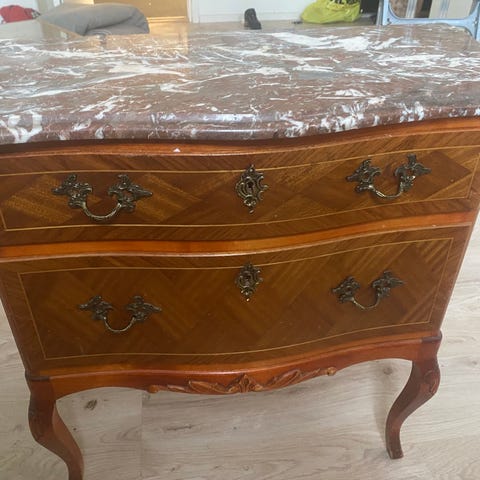 Äldre liten byrå med låda och marmorskiva