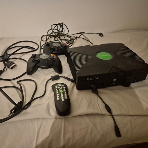 Microsoft Xbox spelkonsol. Stationär konsol för TV-spel med stöd för handkontroller och anslutning via kabel. Passar för spel, film och annan underhållning i hemmet. Exakta tillbehör, lagringskapacitet och modellvariant framgår inte av informationen.