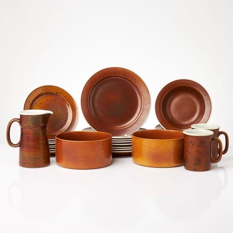 Linnea kaffeservis i porslin med blommönster och guldfärgade detaljer. Servisen på bilderna består av kaffekoppar med fat och assietter, ett större serveringsfat med handtag samt en hög vas.