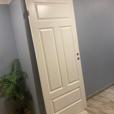Vit Swedoor, innerdörr med spegelmönster och monterat metallhandtag med lås till badrum