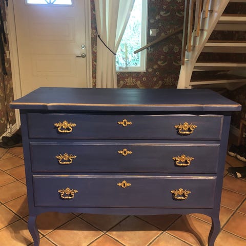 En äldre byrå, blåmålad tre rymliga lådor. Byrån är gedigen träbyrå, inte spånskiva eller mdf i byrån