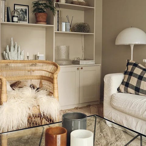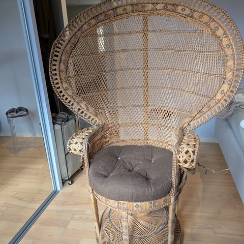 Flätad rottingfåtölj och korg i brun färg. Fåtöljen har rundad rygg och sits med stabil fot i samma material. Korgen är avlång med handtag på sidorna och passar till förvaring eller som kompletterande inredningsdetalj. Båda delarna är tillverkade i flätad rotting i naturlig brun ton.