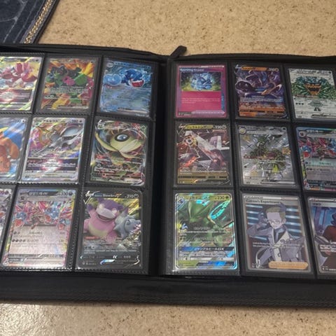 Pokémon samlarbilder kortsamling i pärm. Flera olika Pokémon-kort förvarade i plastfickor i en ringpärm. Blandade typer av kort, både vanliga och glittriga, från olika serier och generationer. Passar för samlare som vill utöka sin samling eller organisera sina kort i pärmformat.