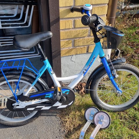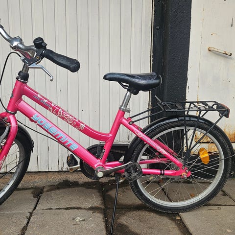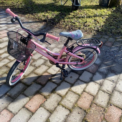 Crescent barncykel med 16" hjul i rosa färg. Cykeln har låg ram som underlättar på- och avstigning för barn. Utrustad med korg fram, pakethållare bak, stänkskärmar, kedjeskydd och stödfot. Sadeln är justerbar i höjd för att kunna anpassas efter barnets längd. Passar som första trampcykel för barn som är redo för 16-tums hjul.