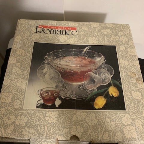 Arcoroc "Fleur" bål set med slev, 8 koppar samt hängare till dem. Använd någon enstaka gång, har sedan dess stått oanvänd i svärmors förråd. Dags att någon annan har glädje av den, kanske till någon av vårens och sommarens alla fester?