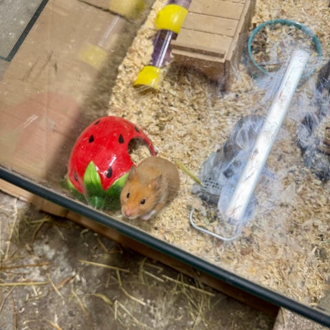 Min hamster letar efter en ny familj. Den kommer med bur