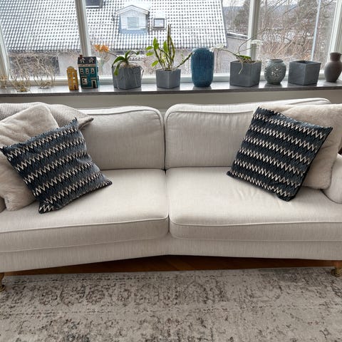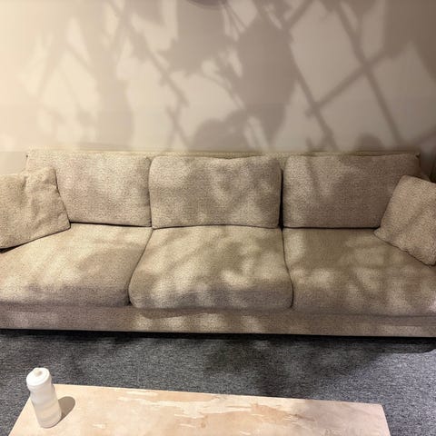 Soffa från Furninova, mörk beige färg med stoppningen i sittplymåer är en kombination av memory foam och fjäder som gör soffan mjuk och bekväm. När man väl har satt sig så är det svårt att resa sig igen. Mail för fler bilder.