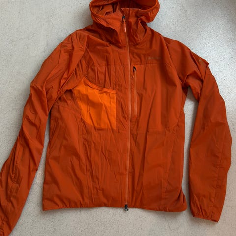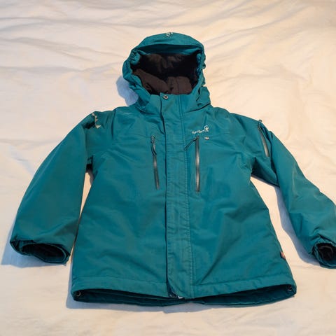 Jacka för junior i storlek M. Jackan är blå och tillverkad i polyester. Modellen har hel dragkedja framtill, dragkedjeförsedda fickor och justerbar huva. Insidan är slät med förstärkta partier vid sidorna. Passar som ytterjacka vid vardagsbruk och utomhusaktiviteter. Tejpen har delvis släppt i Innerkragen. Bra fjälljacka.