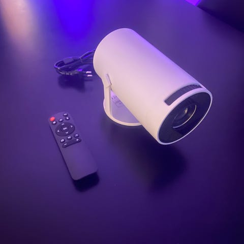 Projektor i svart utförande. Enheten projicerar bild direkt på vägg eller duk och visar bland annat startskärm med appar som Netflix, YouTube och andra streamingtjänster. Lämplig för film, serier och annan mediauppspelning i hemmet eller mindre rum. Ansluts till ström via nätkabel. Ytterligare tekniska specifikationer som upplösning, ljusstyrka och anslutningar framgår inte av underlaget.