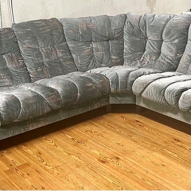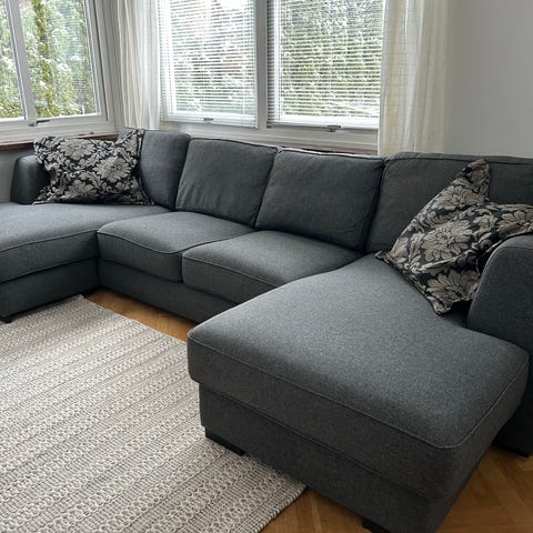 Hörnsoffa med en förvarings box inga hål eller så. En liten fläck på förvarings boxen ( spillt te) annars Bekväm och stor soffa. Går att dela den lätt i sektioner och transportera