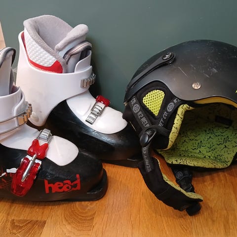 Två par slalompjäxor, två par snowboardboots, stavar, hjälm