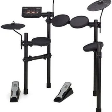 Elektroniskt trumset i svart utförande. Setet består av flera trum- och cymbalpads monterade på stativ, två fotpedaler samt kontrollmodul med inbyggda trumkit och justerbar volym.