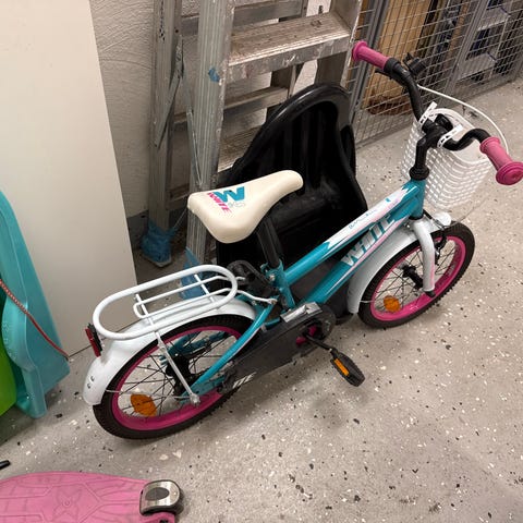 Apollo barncykel med 16" hjul i rosa färg. Cykeln har fotbroms bak och handbroms fram, kedjeskydd, stöd samt pakethållare bak. Utrustad med cykelkorg fram och styrstång baktill för att en vuxen ska kunna hjälpa till att styra och skjuta cykeln. Lämplig som första trampcykel för barn som passar 16" hjulstorlek. Mycket gott skick och väldigt lite använd