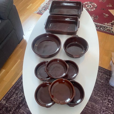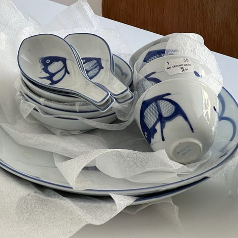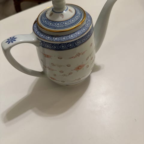 Tekoppsset i porslin med flerfärgat, dekorerat mönster. Setet består av flera koppar med tillhörande fat samt kanna och sockerskål med handtag. Passar för servering av te eller kaffe i hemmet eller vid dukning vid särskilda tillfällen.