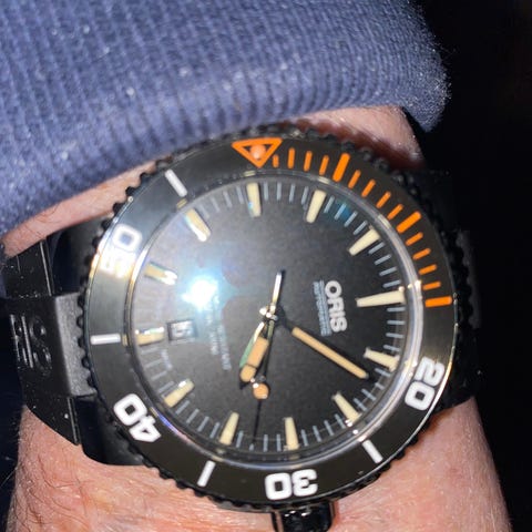 Säljer en Oris dykare på gult gummiband med viklås.