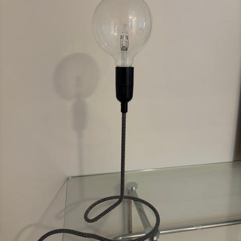 Bordslampa i metall med industriell utformning. Lampan har en rund fot, rak lamparm och synlig dekorativ glödlampa med varmtonat glas. Strömsladd med stickkontakt är fäst vid lampfoten. Passar som belysning på skrivbord, sängbord eller hylla. Märke och modell är okända.