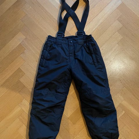 Täckbyxor av märket McKinley. Storlek 122. Svarta med reflexer. Går högt upp på magen/ryggen med hängslen, dragkedja i fram på magen. Utan skador.