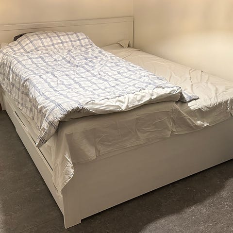 Säng med hög, vadderad sänggavel i mörkgrå textil. Sängramen är klädd i matchande mörkgrått tyg och står på ben i trä. Överkanten har en vit bäddmadrass. Passar som enkelsäng i sovrum eller gästrum. Pris 2.000 kr dubbel-säng, 500 kr enkel-säng. Finns i Boden