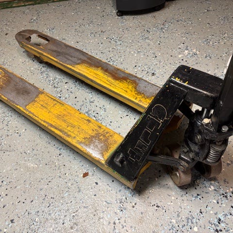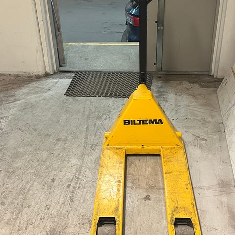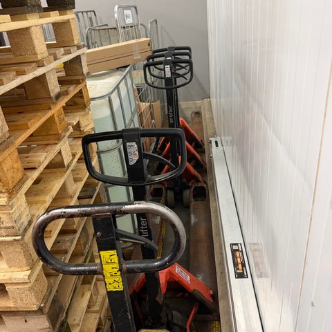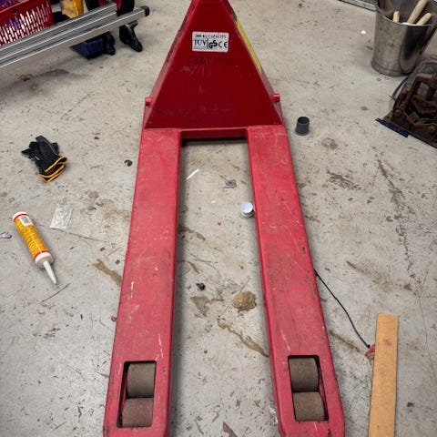 Pallvagn med enkel hjul. Den lyfter 2500kg. Obetydligt använd