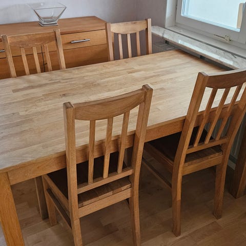 Säljer matbord i ljusbrun ek med 6 stolar i svart skinn. Mått 160x90 cm