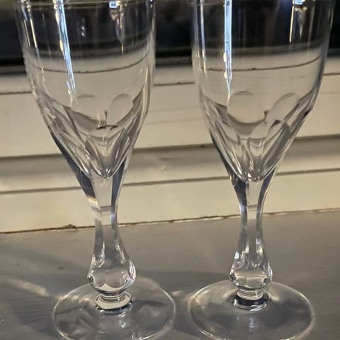 Små vinglas i klarglas. Glasen har fot och kort, kraftig stjälk med dekor i glasmassan. Passar för servering av vin, dessertvin eller liknande drycker. Säljes som set om två glas.