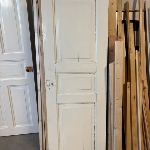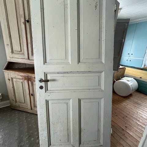 Spegeldörrar i par för tidstypisk renovering. Dörren har klassisk spegelindelning. Passar som innerdörr mellan rum i exempelvis vardagsrum, matsal eller sovrum i lägenhet eller hus med äldre stil. Kan transporteras inom landet mot ersättning.
