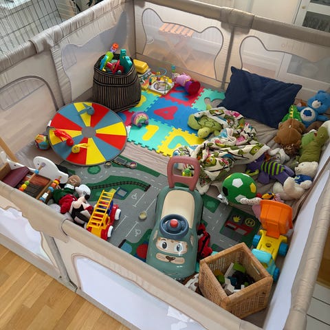Lekhage med nätväggar i grå färg och botten i tyg. Två öppningar med dragkedja. Nytvättad och i fint skick. Funkar bra som lekutrymme och är stabil, kommer från rök- och djurfritt hem.