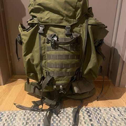 Snigel Design ryggsäck i kamouflagemönster. Ryggsäcken har stort huvudfack med toppöppning och flera ytterfickor. Utsidan är försedd med MOLLE-fästen för extra utrustning. Justerbara axelremmar och avtagbart, vadderat höftbälte ger stöd vid tung packning. Passar för friluftsliv, vandring eller tjänstebruk där robust packning behövs.
