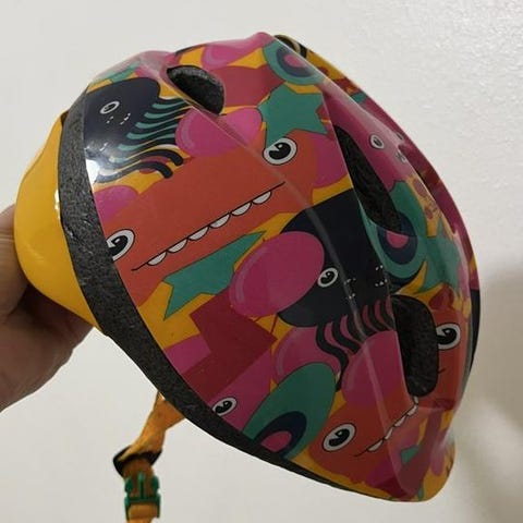 Occano cykelhjälm i svart och neongul färg för barn. Hjälmen har ventilationsöppningar och justerbart spänne under hakan. Invändig märkning visar CE-godkännande enligt EN 1078:2012. Passar för cykling och liknande aktiviteter där huvudskydd behövs.