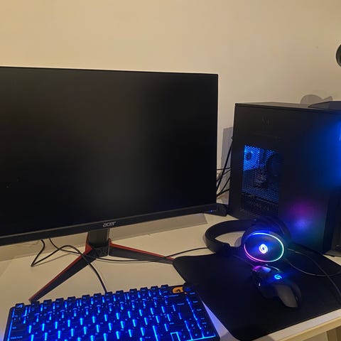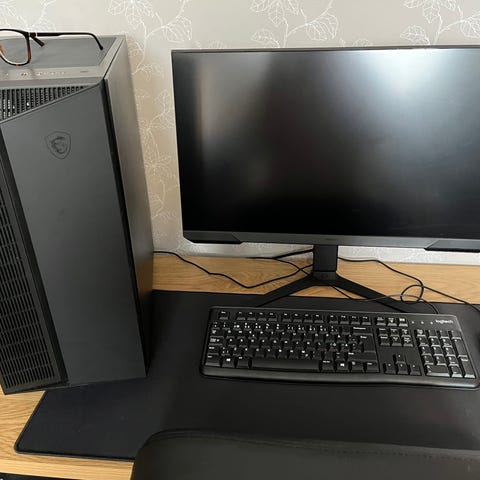 Dator, skärm, mus, tangentbord och mikrofon med mikrofonarm.